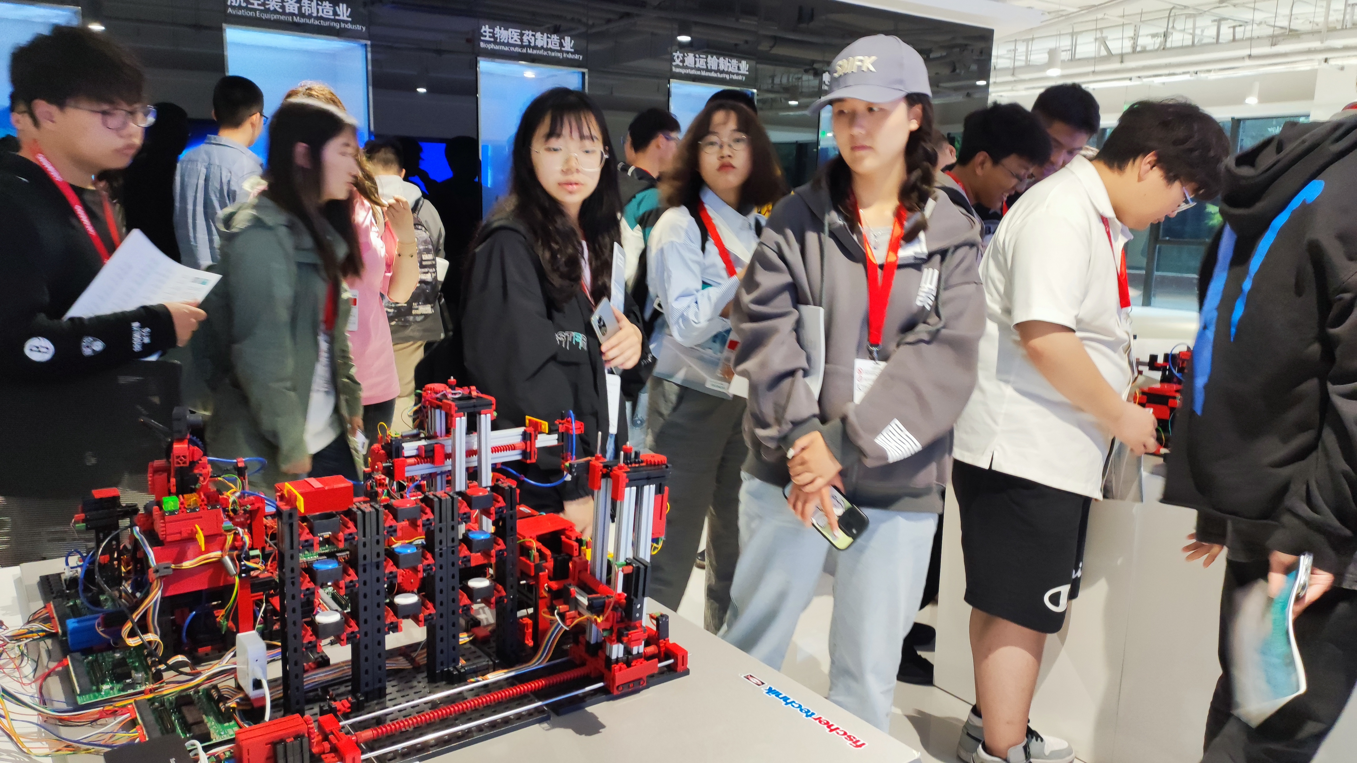 在离散行业数字化示范线,讲解员对大规模定制化的未来制造模式进行了说明。通过互动演示装置,同学们沉浸式地体验了数字孪生以虚拟的方式对制造环节进行指导和优化,以满足大规模定制化下的效率和个性化的结合。
