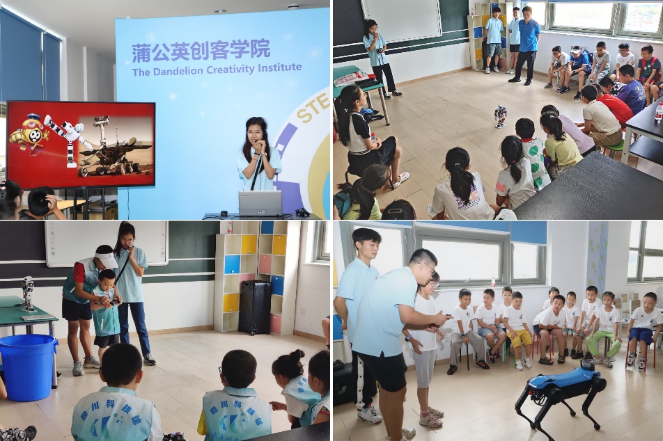 回到教室后,志愿者宋伊涵、夏旗、张秋明、吴梓珲为学生们介绍了机器人的基本知识,并展示了跳舞机器人、四足机器人,志愿者蔡嘉和熊宇星展示了活泼的智能机器狗Mini。在体验环节,学生们纷纷举手参与,在志愿者们的指导下,成功操控机器人和机器狗前进、跳跃,引来学生们阵阵欢呼。