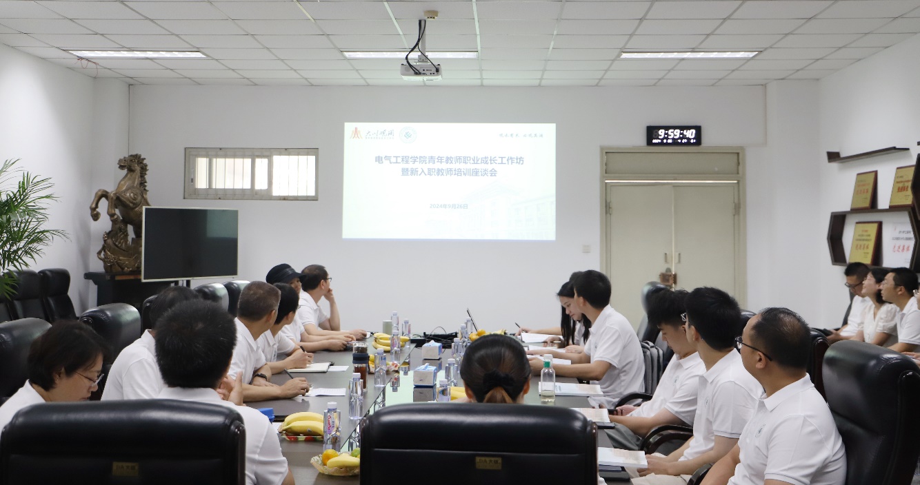 青年教师职业成长工作坊暨新入职教师培训座谈会在基础教学楼会议室举行。学院党委书记赵昱辉、院长肖先勇,副书记兼纪委书记、工会主席张英敏,电气工程系党支部书记、院长助理陈实,系主任王渝红,自动化系党支部书记刘念、系主任赵涛,电工电子基础实验教学中心党支部书记印月、中心主任沈晓东,专业实验中心主任肖勇,行政党支部书记、人事秘书邓清华,以及新入职教师参加了培训座谈。座谈会由张英敏副书记主持。